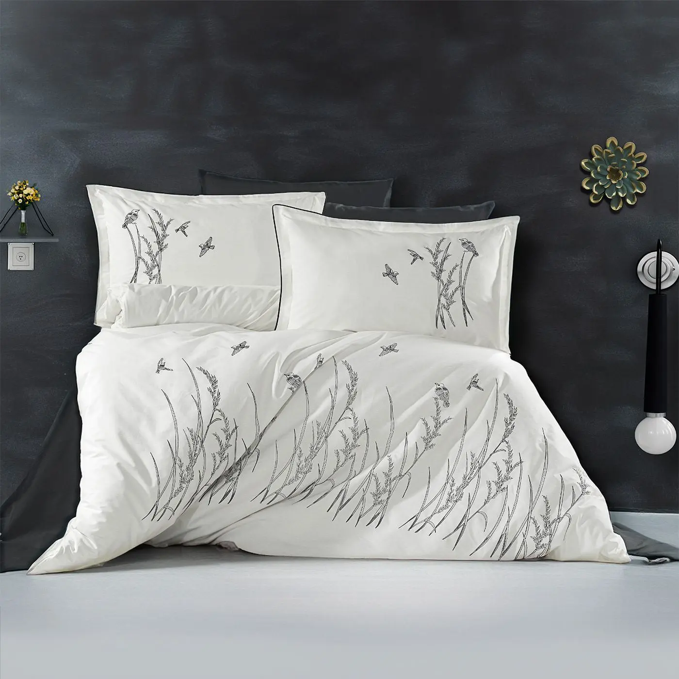 Seti i mbulesave të jorganit Brode me madhësi mbretërore ofron një ndjesi miqësore me lëkurën me pëlhurën e tij natyrale pambuku dhe saten dhe plotëson dhomën tuaj të gjumit me një prekje elegante.